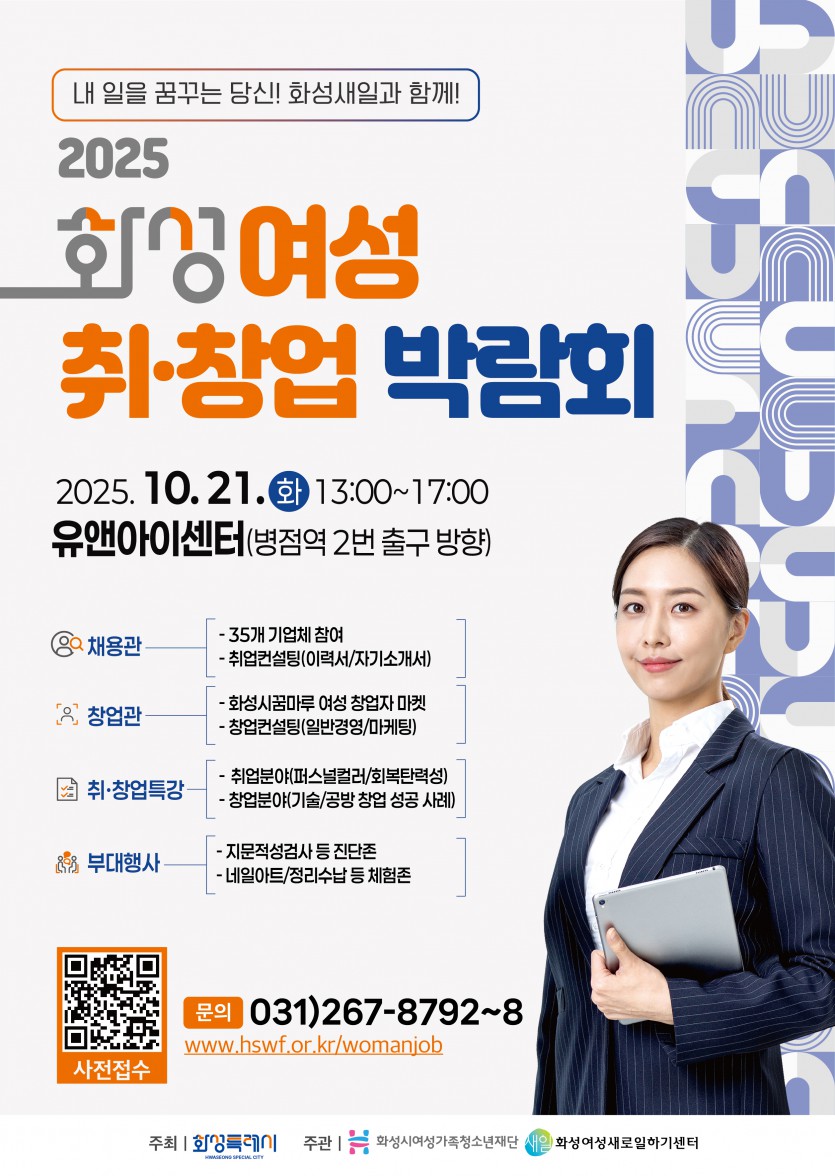 화성특례시가 주최하고 화성시여성가족청소년재단, 화성여성새로일하기센터에서 주관하는 2025년 화성여성 취.창업박람회가 오는 10월21일(화)