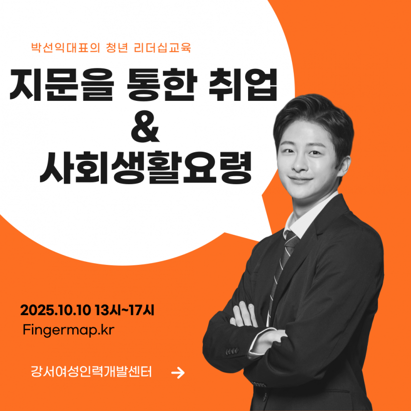 '지문"을 통한 취업 & 사회생활요령이라는 주제로 청년을 위한 리더십교육이 10월16일 13:00~17:00까지 4시간 진행됩니다.