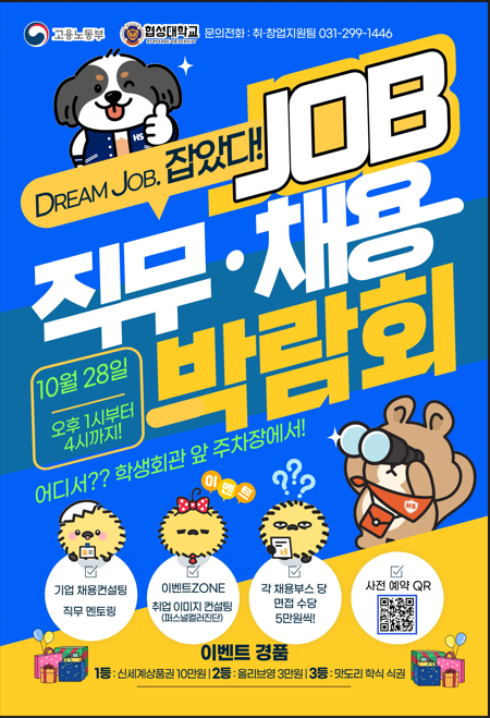 고용노동부가 주최하고 협성대학교가 주관하는 JOB직무.채용박람회가 오는 10월28일(화) 학생회관에서 개최되며,